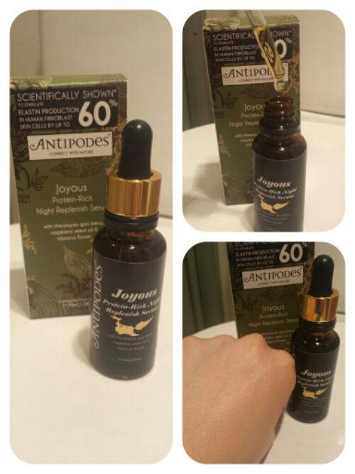 What I got: This is a bottle of Antipodes Joyous Protein-rich Night Replenish Serum with a dropper. It is suitable for normal to ultra-dry skin types. A silky night serum that helps rescue dry, damaged skin. Himalayan goji berry boasts up to 19 amino acids to help optimise your skin’s appearance. Red raspberry seed oil blends with New Zealand blackcurrant, a rich source of essential fats like gamma-linolenic acid (GLA). South Pacific hibiscus flower freshens your complexion, while berry fragrance imparts pure joy. Suited to normal and ultra-dry skin conditions. Contains Goji berry, Wild blackcurrant, Hibiscus flower and Wild Blackcurrant.