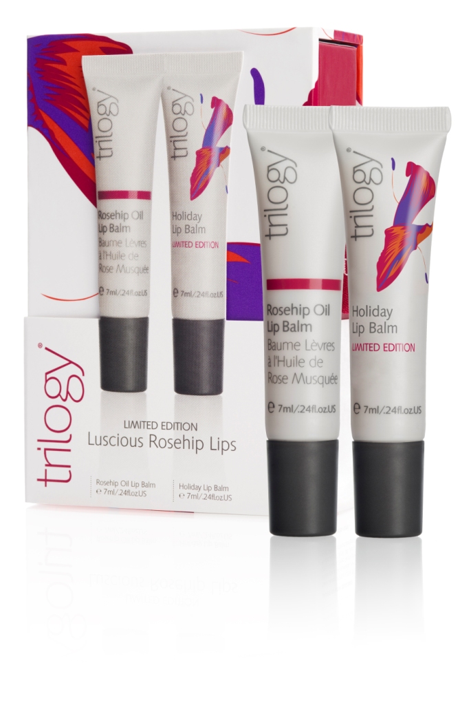 Trilogy Luscious Rosehip Lips (RRP $23.90). Zingy, peppermint-fresh Trilogy Rosehip Lip Balm (7.5ml) is an ultra-moisturising, petroleum-free, certified natural lip treatment for the repair of dry and chapped lips. The special treat included is limited edition, not-for-sale Trilogy Holiday Lip Balm (7.5ml) with a sassy red tint and spicy cinnamon flavor – lip-smacking lusciousness perfect for mistletoe moments.