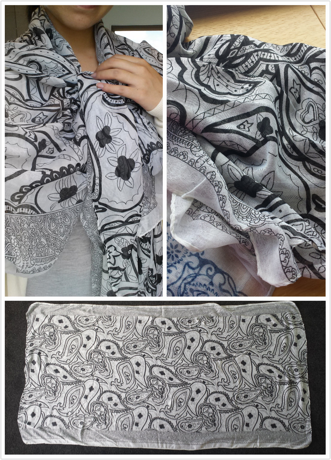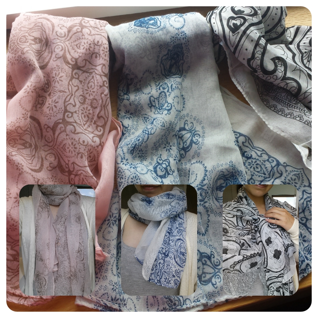 Overall: These lightweight scarfs feels smooth and soft to the touch. My favourite one would be the pink – I love the pattern and the colour! The large size of the scarf means that I can wrap this twice around my neck and also wear it as a shawl tying a knot in the middle! I love rectangle-shaped scarfs as they can be so versatile. I would use these during cool summer nights and also in the office where the air-conditioning can be quite strong.