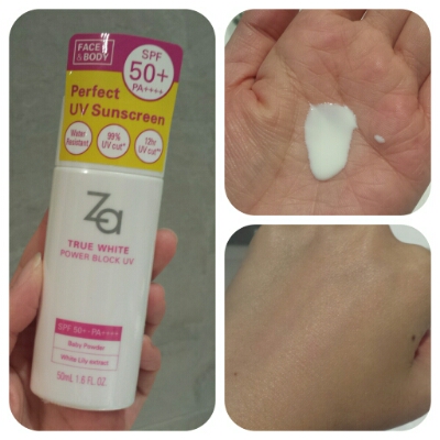 What I got: This is a 50ml bottle of Za True White Power Block UV SPF50+ PA++++.Contains the world’s finest level 0.02 micron UV cut agent, it forms a protective layer to prevent UV rays penetrating into the skin. Gives a smooth baby powder finish for a non-sticky application. It is waterproof with strong sweat and sebum resistance.