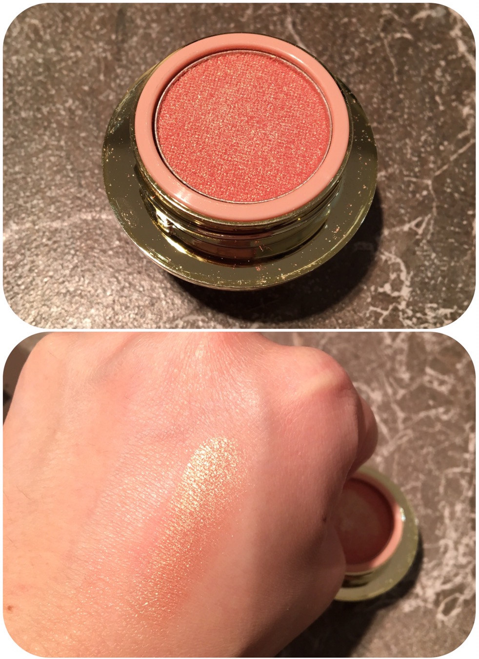 This eye shadow and packaging looks amazing! It is a peachy metallic with a hint of green in it. It glides on smoothly and it not chalky whatsoever. Love this eyeshadow and would like to see more different shades they have to offer!