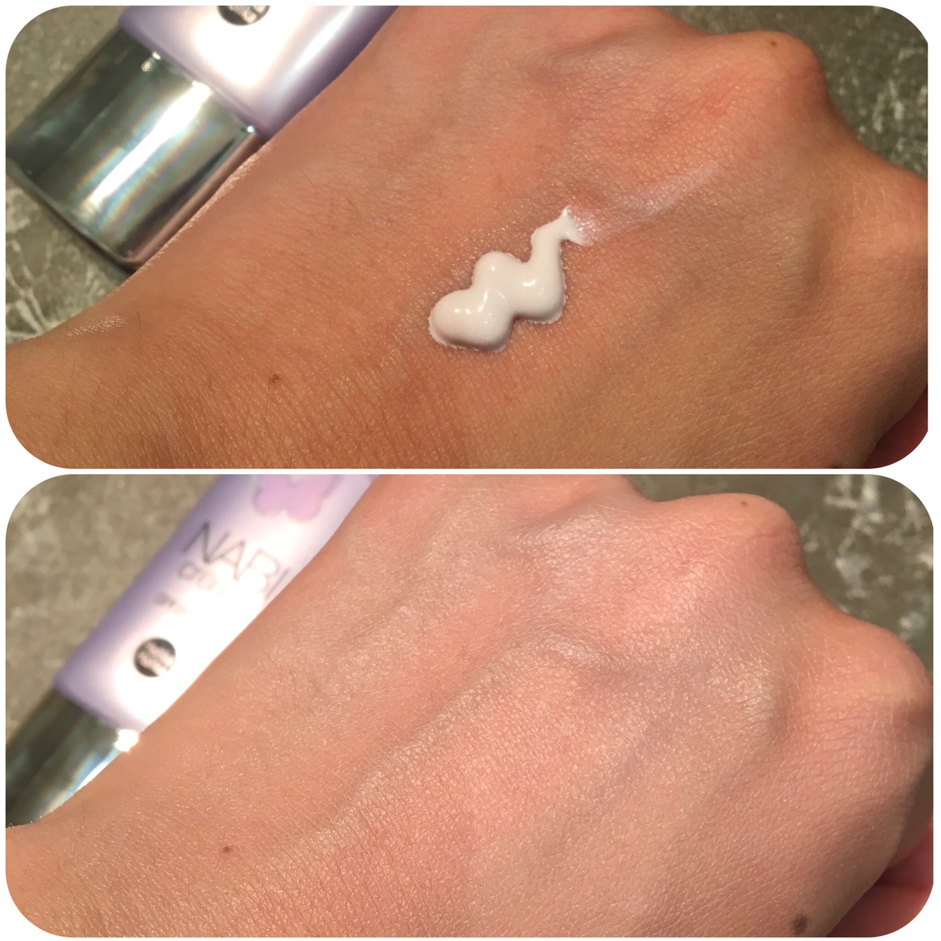 How I find it: I use this more like a colour-correcting sunscreen either under my foundation or on top of my moisturiser as a sunscreen with no foundation on top. I squeeze a few lines on my index, middle and ring finger then press them onto my forehead, cheeks, nose and chin area then blend. I add a bit more onto my neck and jaw area as well as I needed to. The formula blends out easily without giving my skin an obvious white cast or streaks. The lavender shade helps my skin look much more radiant and glowy without being shiny. It helps to even out my yellow or dark areas and make them appear brighter. As you can see in the image below, it brightened up the back of my hand so well but it’s not like a white pigmented cream if you know what I mean.