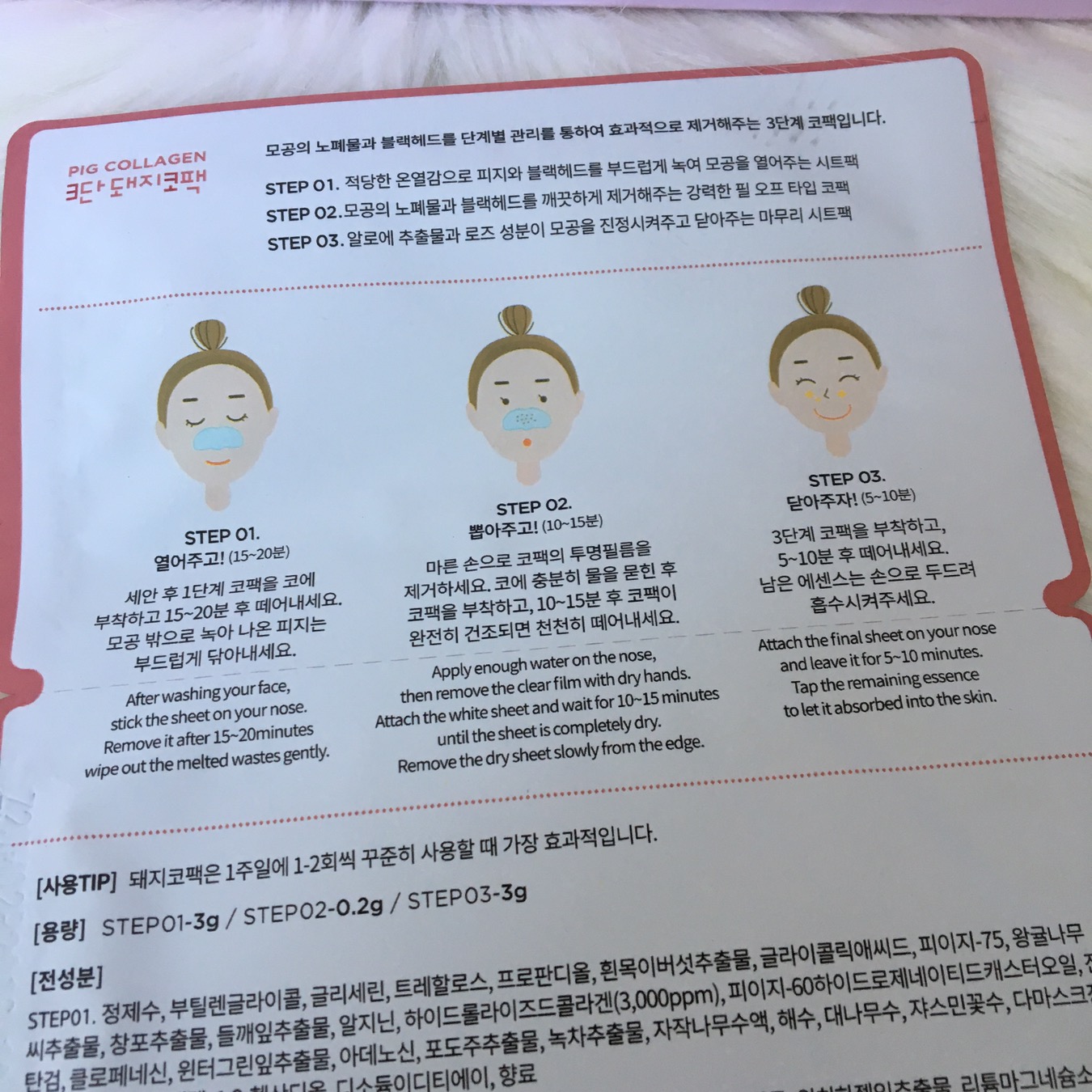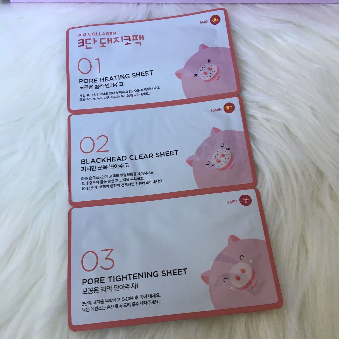 What I got: This is the Me Factory 3-step Pig Nose Pack. A 3-step blackhead pack to remove blackheads and close the pores afterwards. The first step is a pore heating sheet to open up the pores, the second step is the pore strip to pull out blackheads, the third step is to tighten the pores.