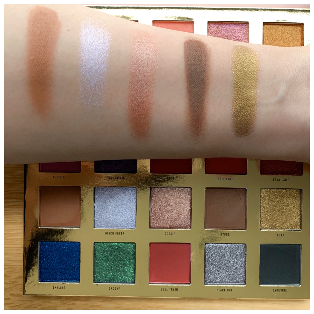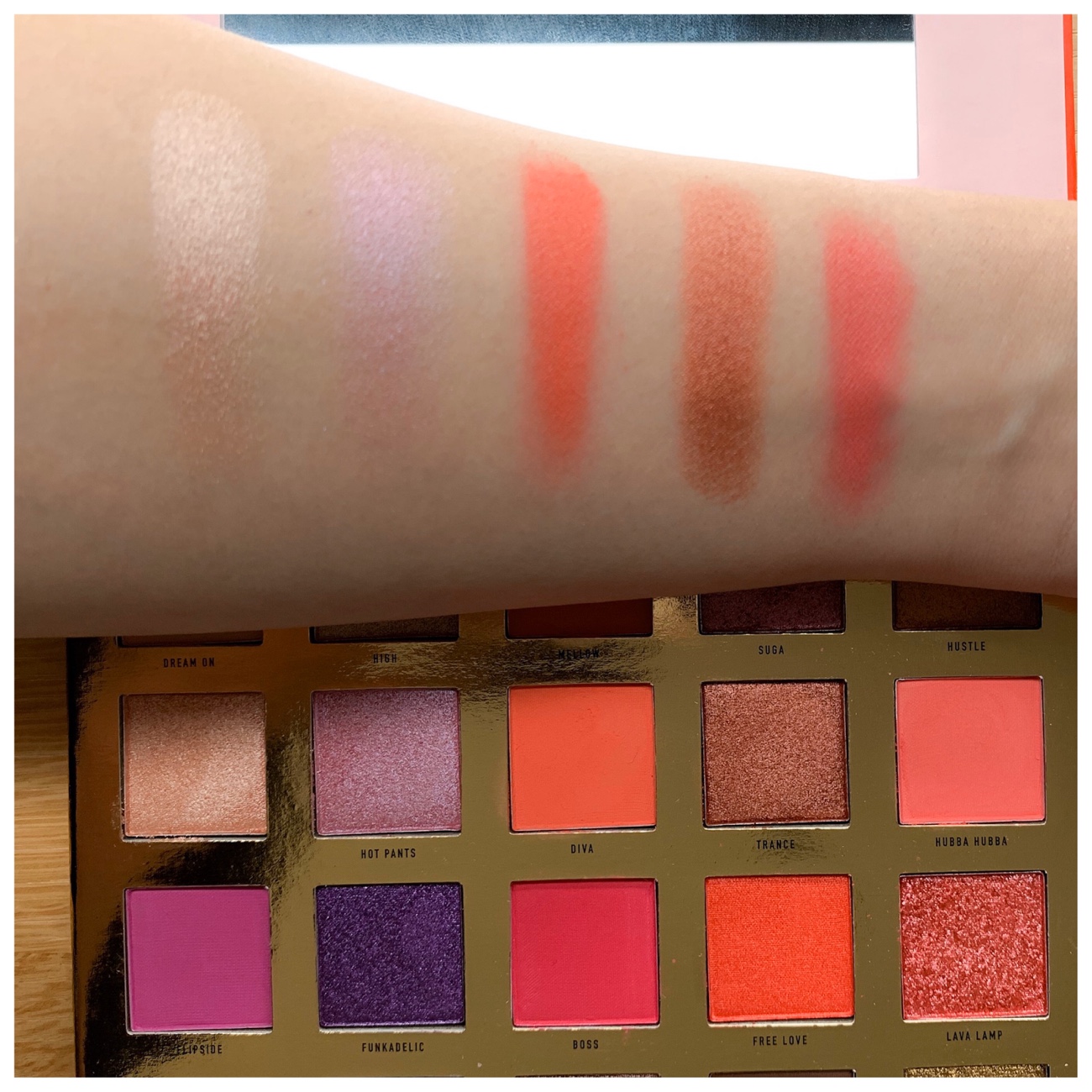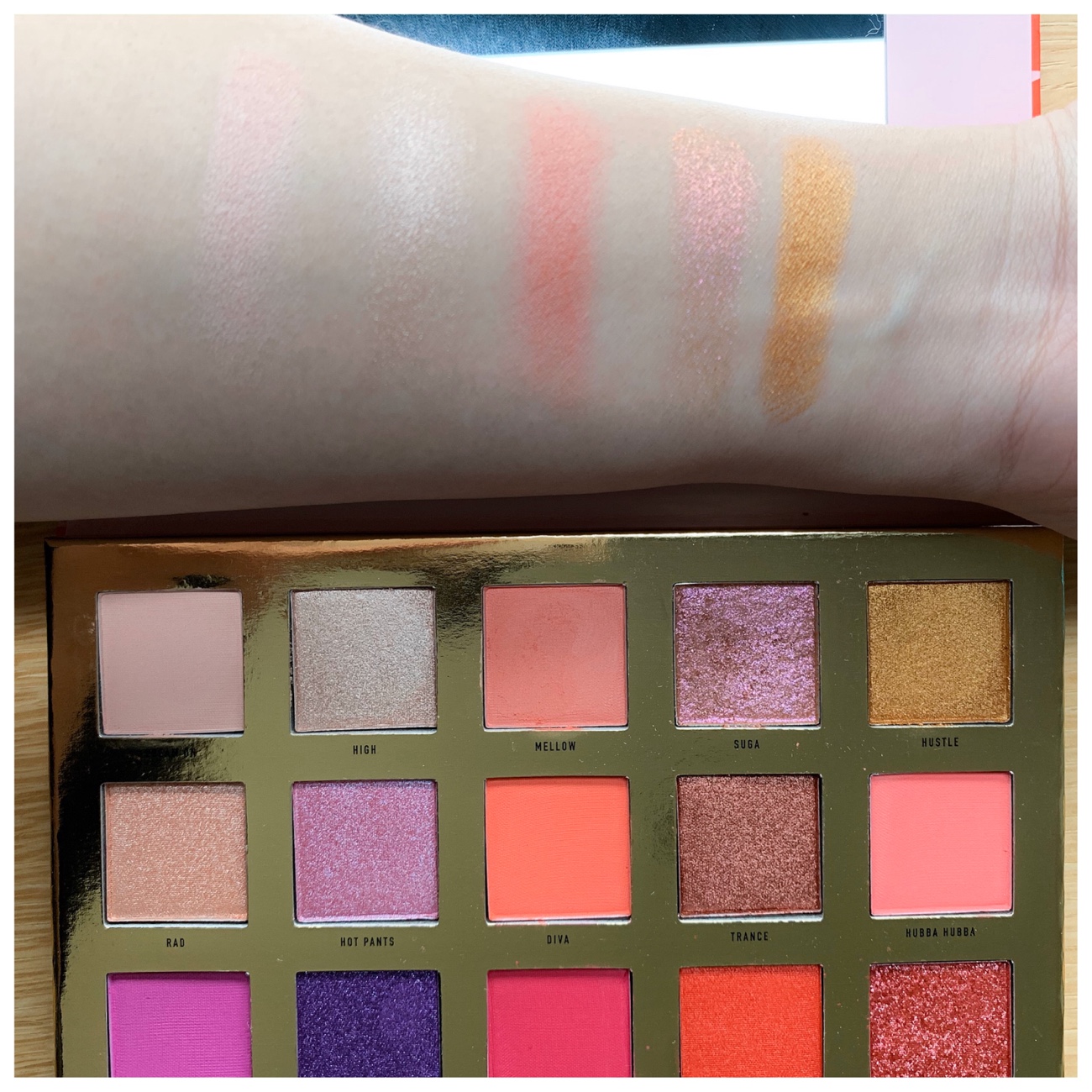 Shades from left to right: Row 1: Dream On, High, Mellow, Suga, Hustle. Dream in is a matte nine shade, High is a shimmery pale champagne. Mellow is a matte peach. Suga is a glittery rose-gold. Hustle is a shimmery yellow gold shade. The first row is mostly lighter shades.