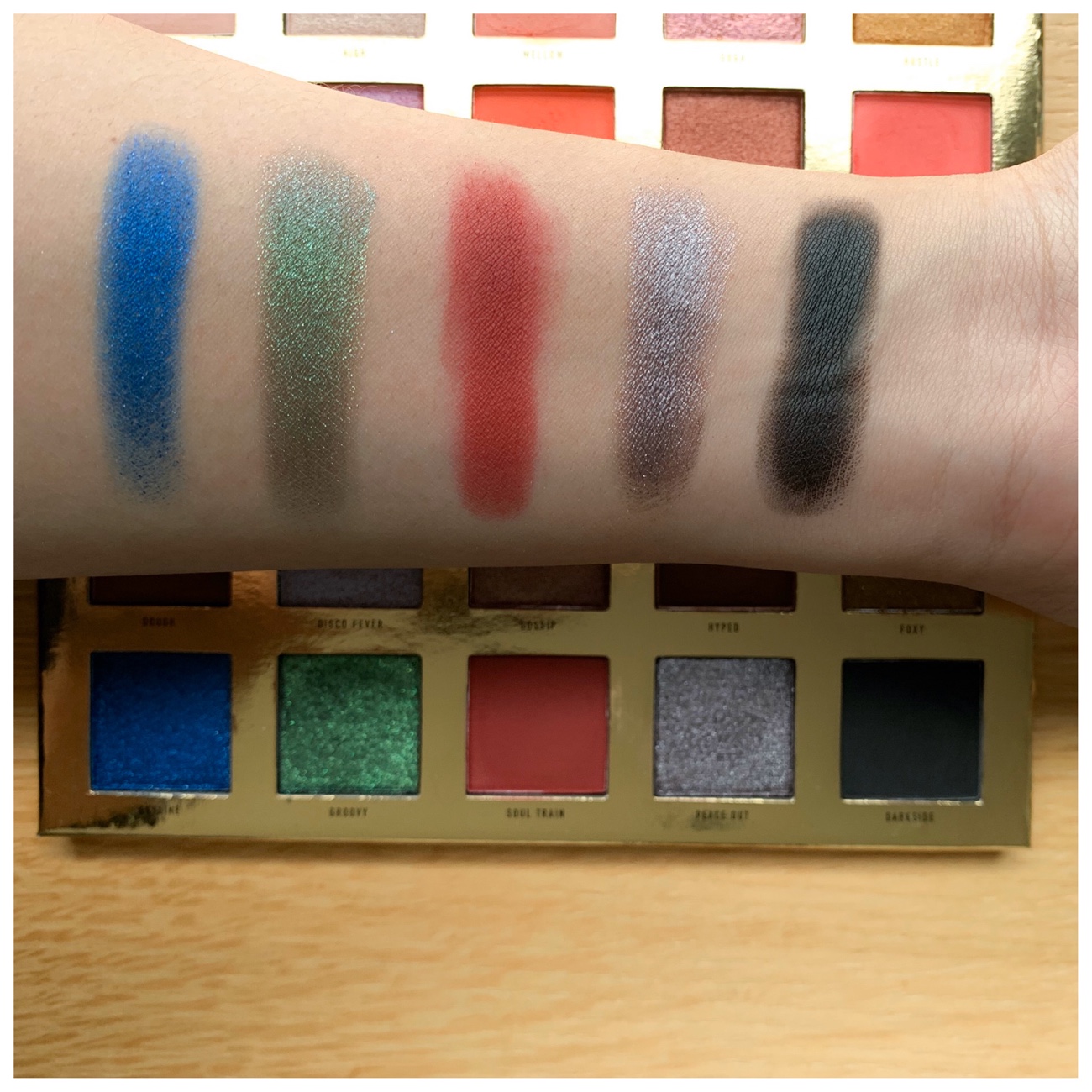 Row 5: Skyline, Groovy, Soul Train, Peace Out, Darkside. Skyline is a gorgeous shimmery cobalt blue. Groovy is a shimmery green with a black shift. Soul Train is a matte burnt red. Peace Out is a true matte black.