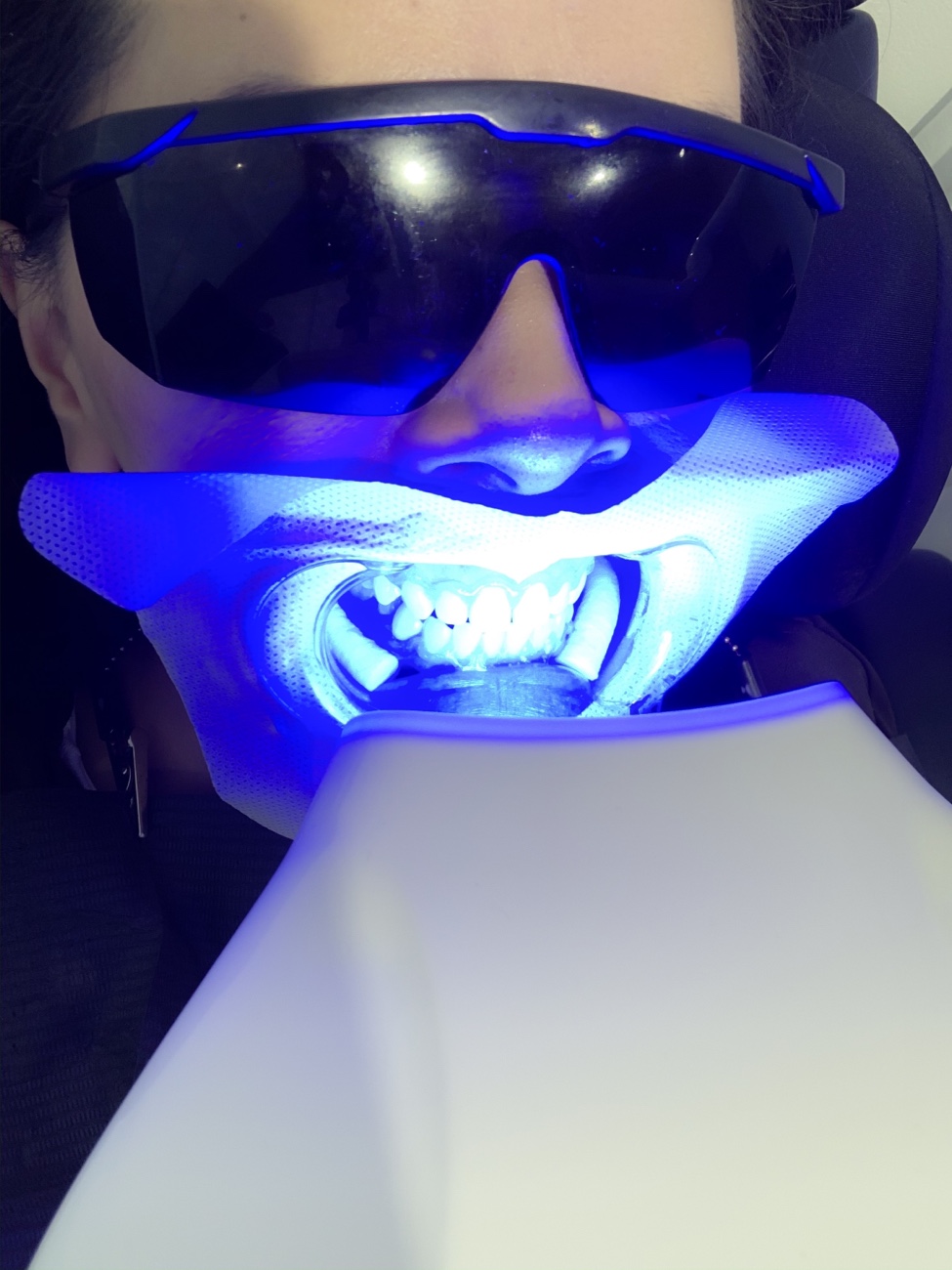 She put a bib on me and some protective eyewear from the UV light. Then in goes that plastic thing that opens up my mouth and Ruby used the shade chart to see what shade my teeth are before (top teeth are S20, bottom row is S24). Followed with cotton rolls around my gums to protect them. She then used a small syringe of gum protector (blue) around my gums and then placed the UV light over to let it harden. Then she proceeds to apply the whitening gel around my teeth and asked me to bite down as long as I can and preferably leave my tongue at the back without touching my teeth or the gel.