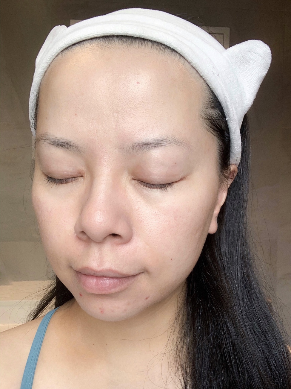 Using this at night, I make sure I double cleanse my face to get rid of all makeup and debris and impurities. It has a cream texture and I use about 4 pumps for an even layer all over the my face. Within about the first minute, I started to feel a little tingling around my cheek area and that subsided very quickly and there were no other sensations to be felt. Leave it on for 10 minutes and then remove gently with a damp, warm cloth. Then rinse everything off with lukewarm water. Skin looks a little flushed, but that calms down very quickly.