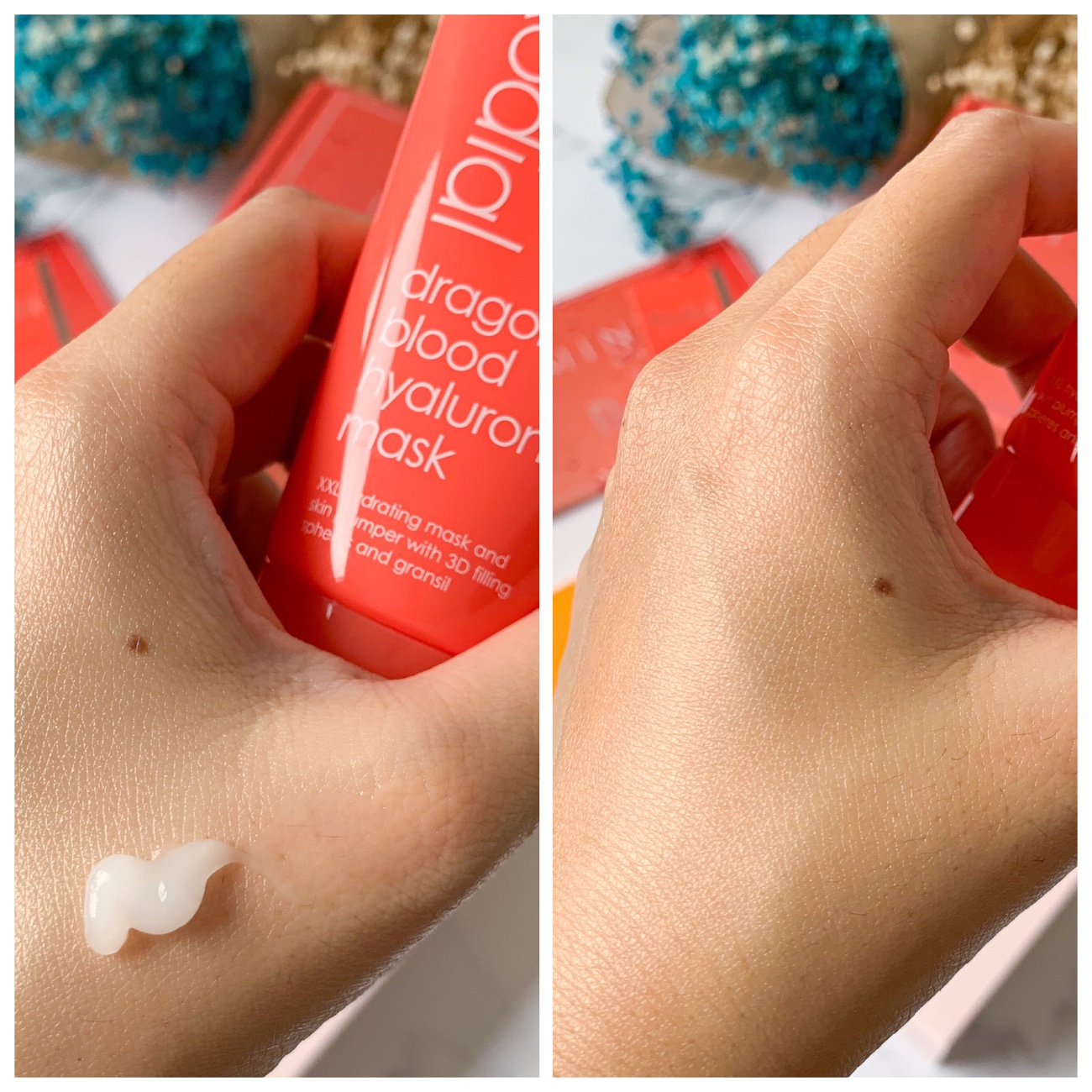 Dragon’s Blood Hyaluronic Mask. This is a hydrating gel-cream mask that you can use as an overnight mask or as an intensive protective mask in-flight. The texture is really fresh and light and very hydrating. It glides onto the skin easily and spreads easily. It disappears soon after application but needed a good 1-2 minutes to absorb and not feel tacky. My skin did not feel greasy or feeling like I have a layer on top of my skin, but at the same time, I did not need to apply anything over it.