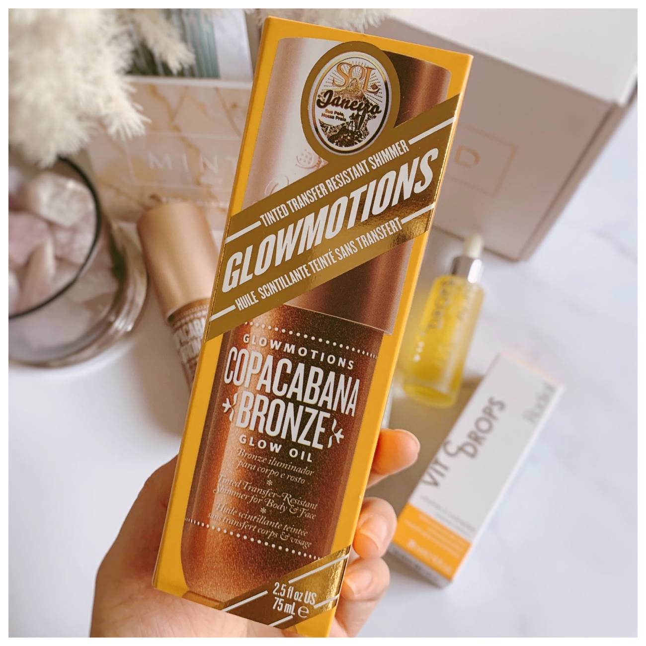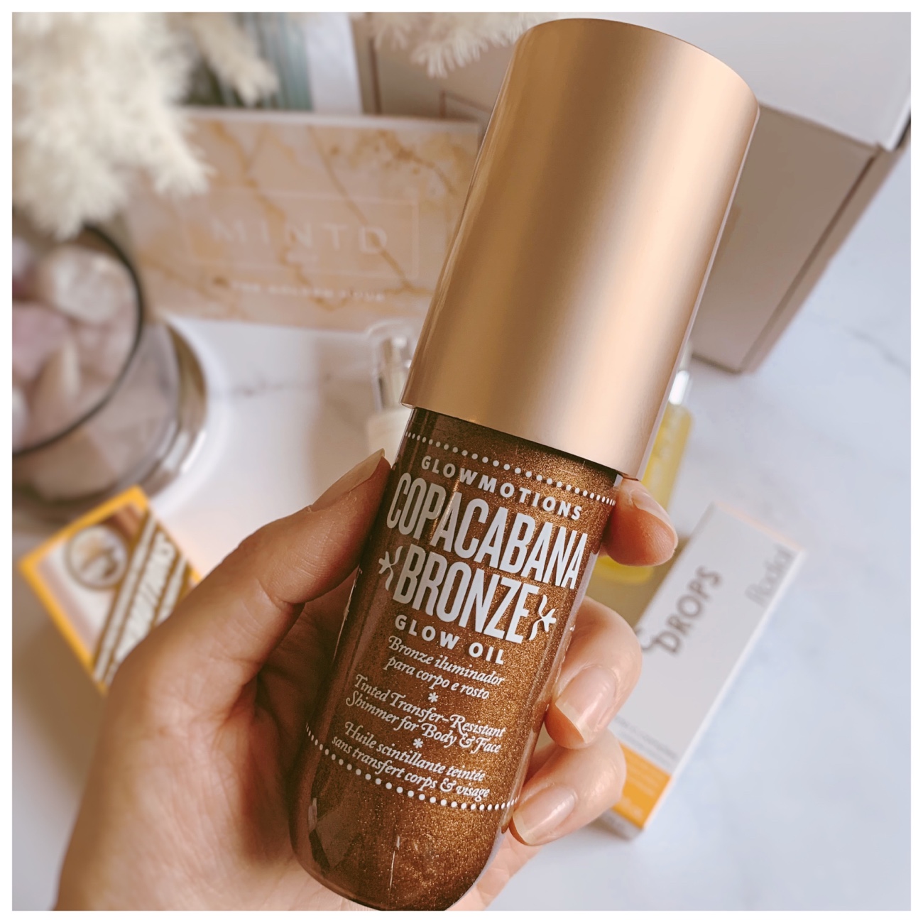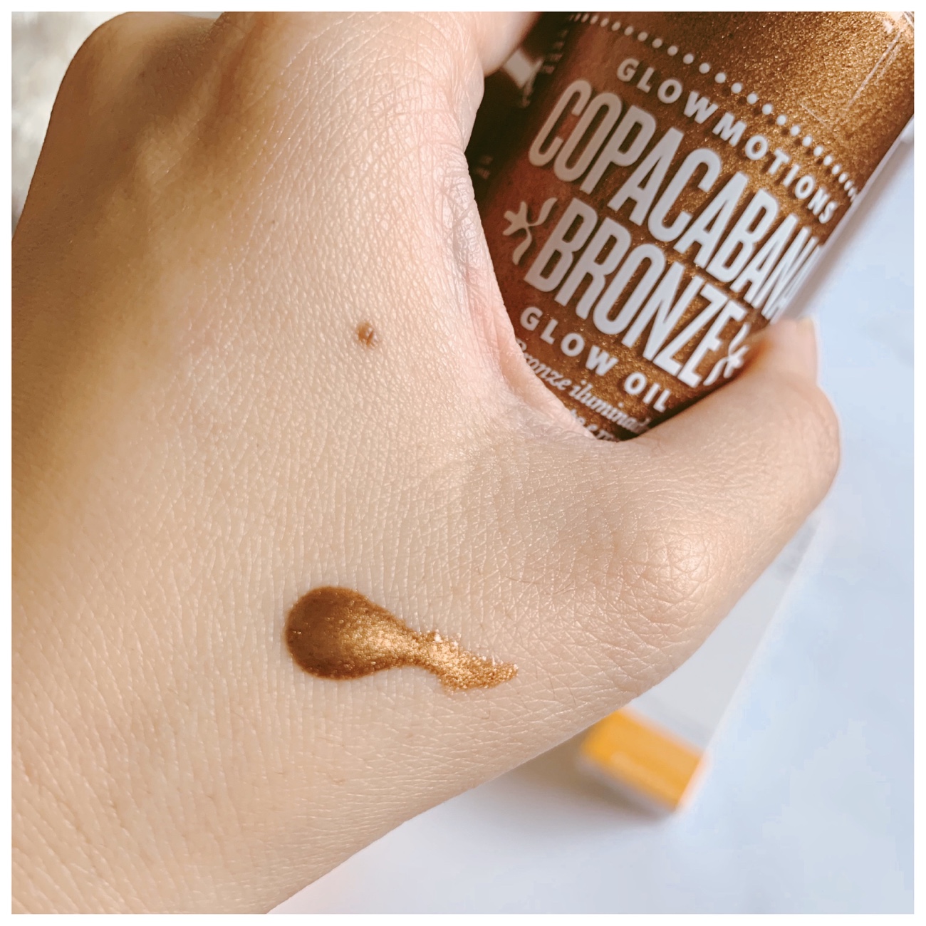 As for the Sol De Janeiro Copacabana Glow Oil, I really loved the packaging – the gold, the bronze, the fancy writing, etc. The bottle is really cute as well, like a large pill with a flat-top plastic cap. I think the bottle is clear so what you actually see on the bottle is the product inside and that kind of blew my mind. Never have I ever used something that looked so deep bronze and shimmery on my skin. I mean I love a glowy, shimmery body oil, but I always go for a champagne gold or a pale rose gold colour. This is a dry oil and the shimmery particles are really fine, so it won’t be obnoxious on the skin. It claims to be transfer resistant, but I think that only applies to gentle touching or your clothes lightly touching. If you use any rubbing motion with a cloth, the shimmer does transfer, but not the bronze colour, that doesn’t transfer. I don’t have an issue with that, but the scent is really overpowering for me. It is a really sweet, caramel-like scent that lingers on for hours.
