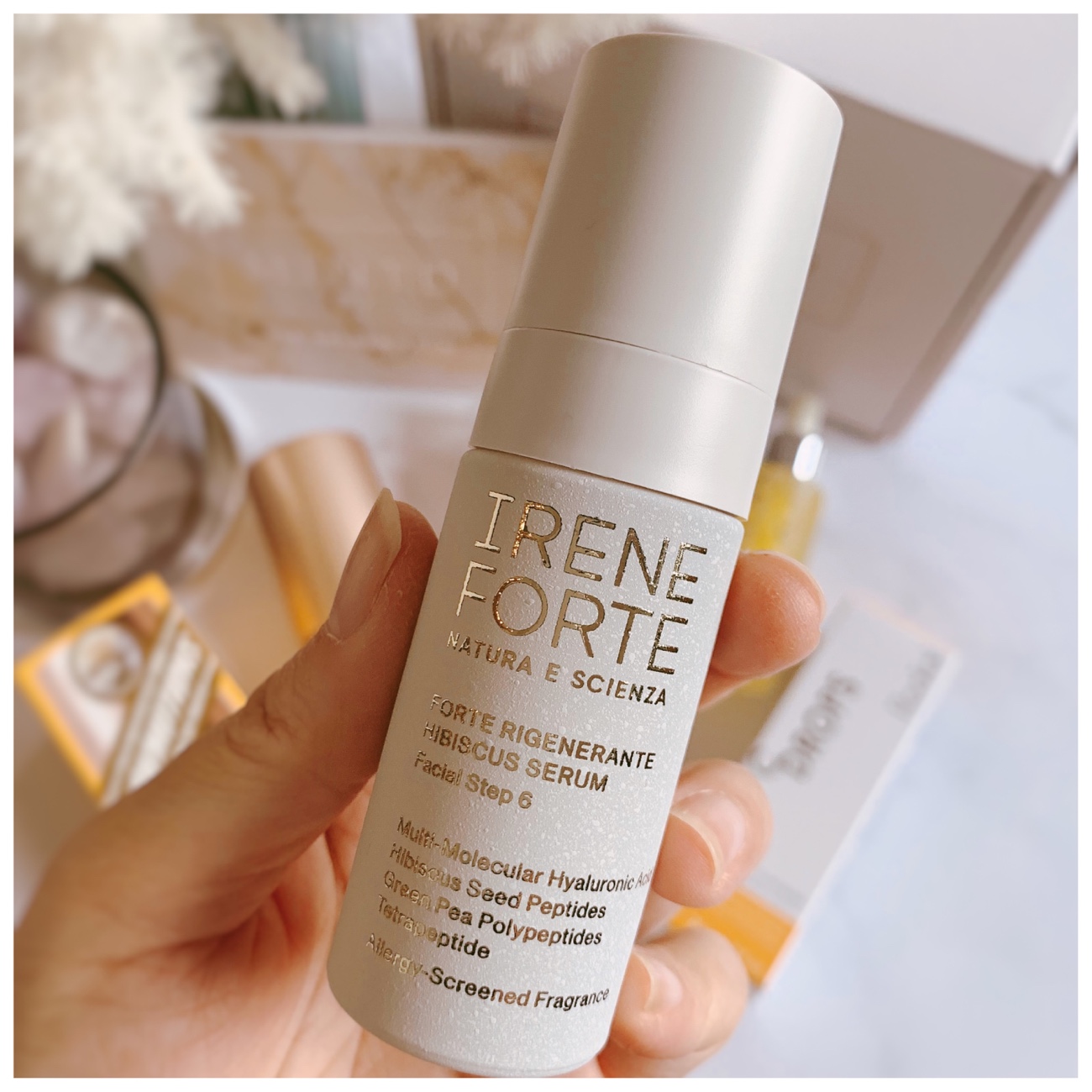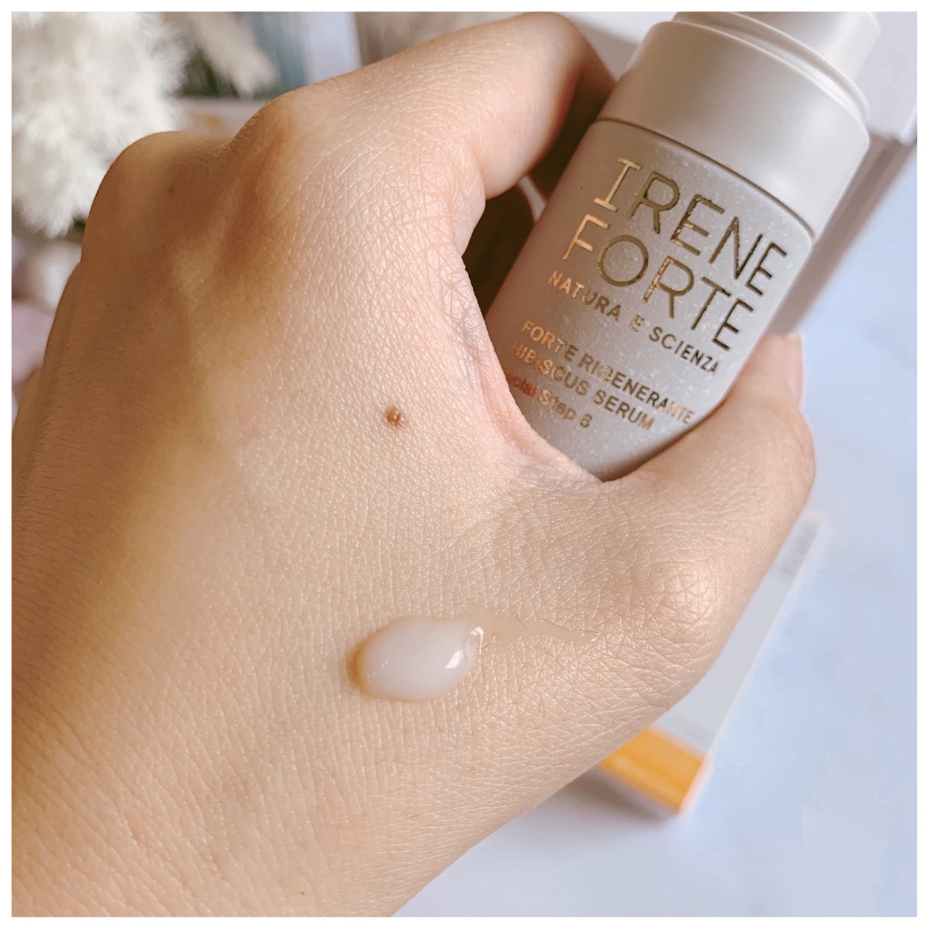 Alright, so I’m going to share with you how I have lined up these products in a skincare routine, this can be for day or night. So after cleansing with a gentle cleanser, I like to use a hydrating mist all over my face to get it slightly damp. Then I start by using 2 pumps of the Irene Forte Hibiscus Serum all over the face and neck and chest area. 2 pumps is plenty of product as it spreads easily and feels really lightweight and hydrating. The product is housed in a shimmery-finished glass bottle (feels weighted and expensive). The semi-transparent gel-like serum is absorbed into the skin easily (and quickly) without leaving any residue. Within a minute, I no longer feel any tackiness.