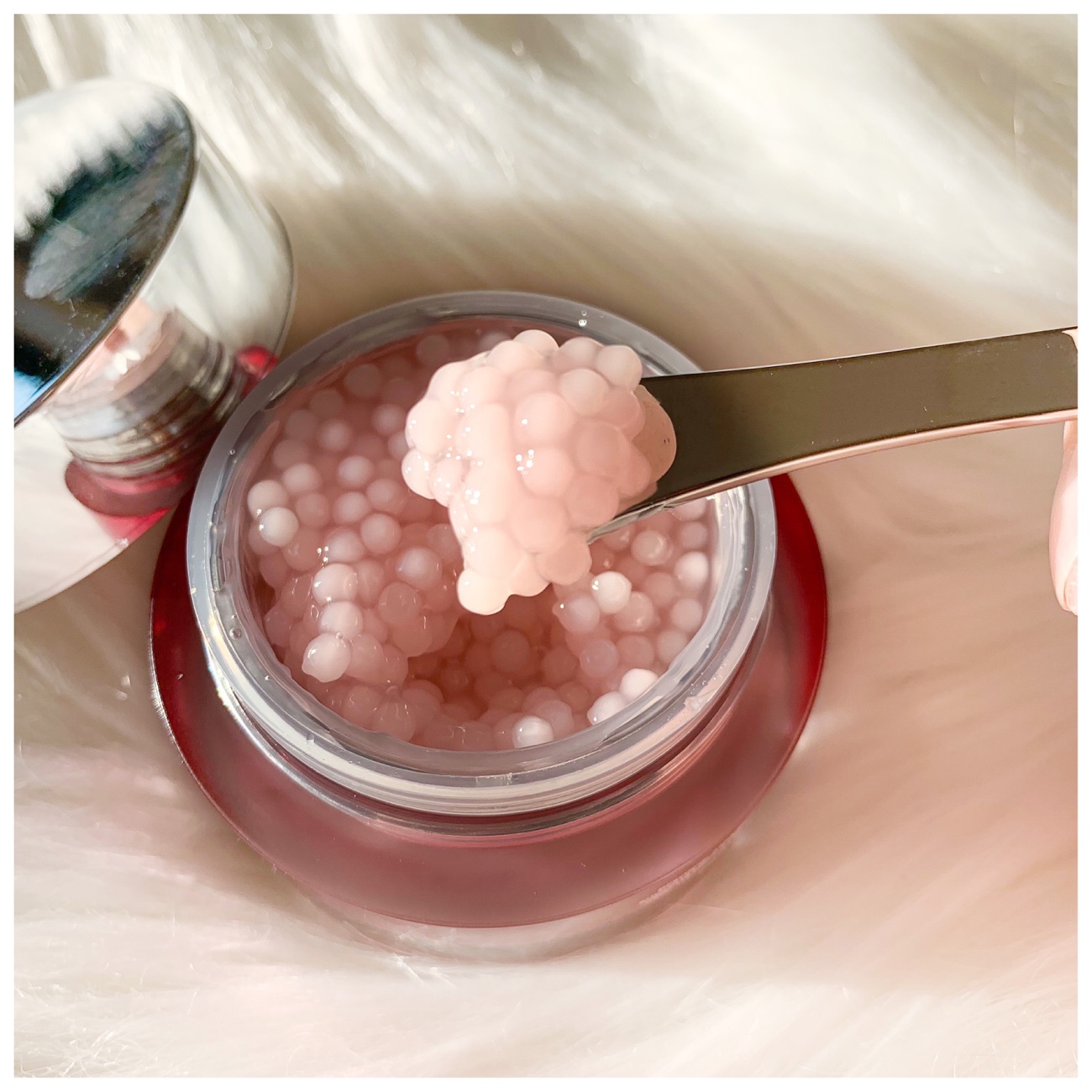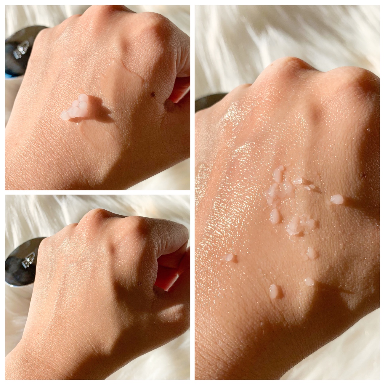 The little pearls are based in a slippery gel base and it comes with a really good quality metal spoon. I pick up about half a spoon of this plumping gel and then mashed the pearls between my palms and mix the formula before I apply it on my face. Trust me, this is the best way to use this moisturiser because the pearls will only go between your fingers and maybe fall off your face if you apply it directly on the face and try to mash the pearls on your face.