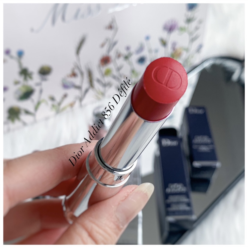 Now we have the Dior Addict lipstick and limited edition Millefiori case (#856 Defile) (3.2g). Dior Addict is the Dior shine lipstick designed like a fashion accessory, with a formula now composed of 90%* natural-origin ingredients, housed in an ultra-couture and refillable case. Intense colour and shine with a vinyl effect, 24h** hydration and 6h*** wear, a formula infused with jasmine floral wax with hydrating properties: Dior Addict lipstick enhances the lips in bright and luminous shades with sensational shine. In its black vinyl lacquered case embossed with the Dior Oblique logo – an echo to the House’s fashion creations – and topped with a silver pearl, the Dior Addict shine lipstick combines simplicity with elegance. Refillable, it slips into this timeless sleeve or one of the couture cases inspired by the Dior runway show designs each season: like a real wardrobe, the refillable lipstick case is available in Indigo Denim, Pink Cannage and Metallic Silver versions, as well as two limited edition Miss Dior Millefiori Boutique inspired versions. As part of the eco-design initiative led by Dior, the new shine lipstick icon is refillable to reduce its environmental impact. The black version uses some 34% less fossil fuels, 36% less greenhouse gases, and 47% less water**** to produce.