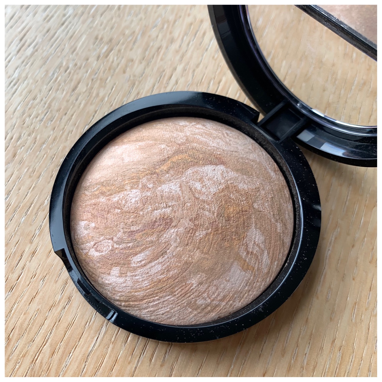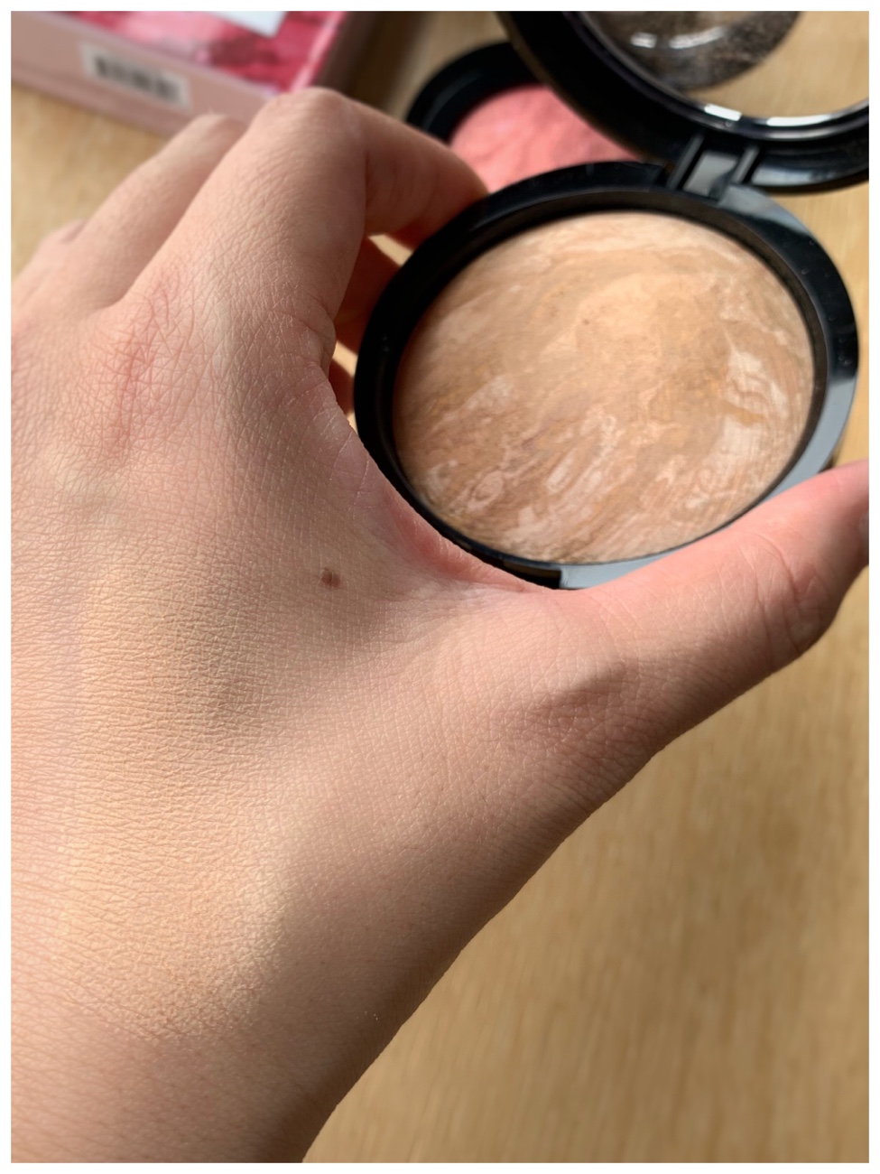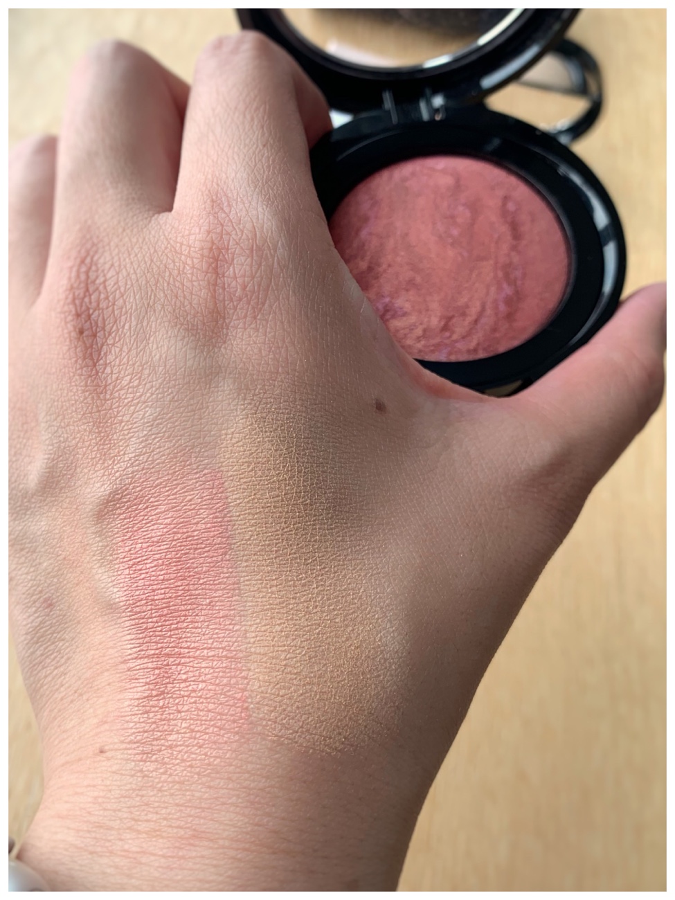 First of all, these products come in simple cardboard boxes and bubble-wrapped. Everything was in perfect condition with just a bit of powder dust inside the compact. Each compact has a small window on the lid to show what’s inside the compact. The mirror is too small to be useful at all for makeup application. The marbled effect of these baked powders is really beautiful.