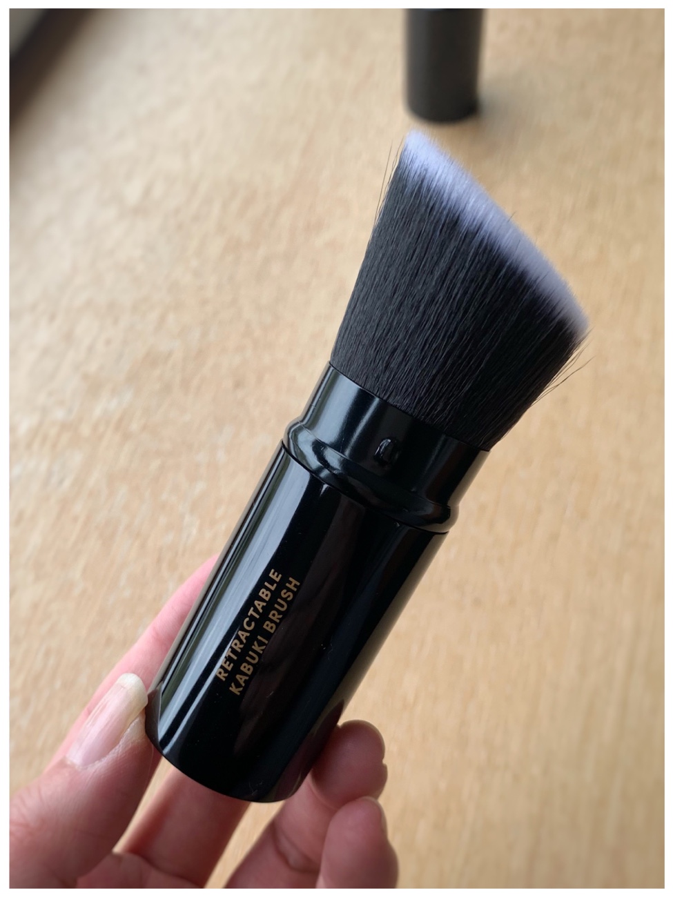 The angled kabuki brush has a lid and is retractable which would be great for travelling. The other purpose for being retractable is that you can use this to control the coverage of the baked formula – you can use this for foundation, bronzer, blush, etc. The longer the bristles are exposed, the fluffier the brush is, and you get more sheer coverage. If you retract the bristles, you get dense bristles, thus higher coverage. I find that the brush isn’t dense enough to create a good medium coverage as I could with my other kabuki brushes, but the retractability and versatility are great.