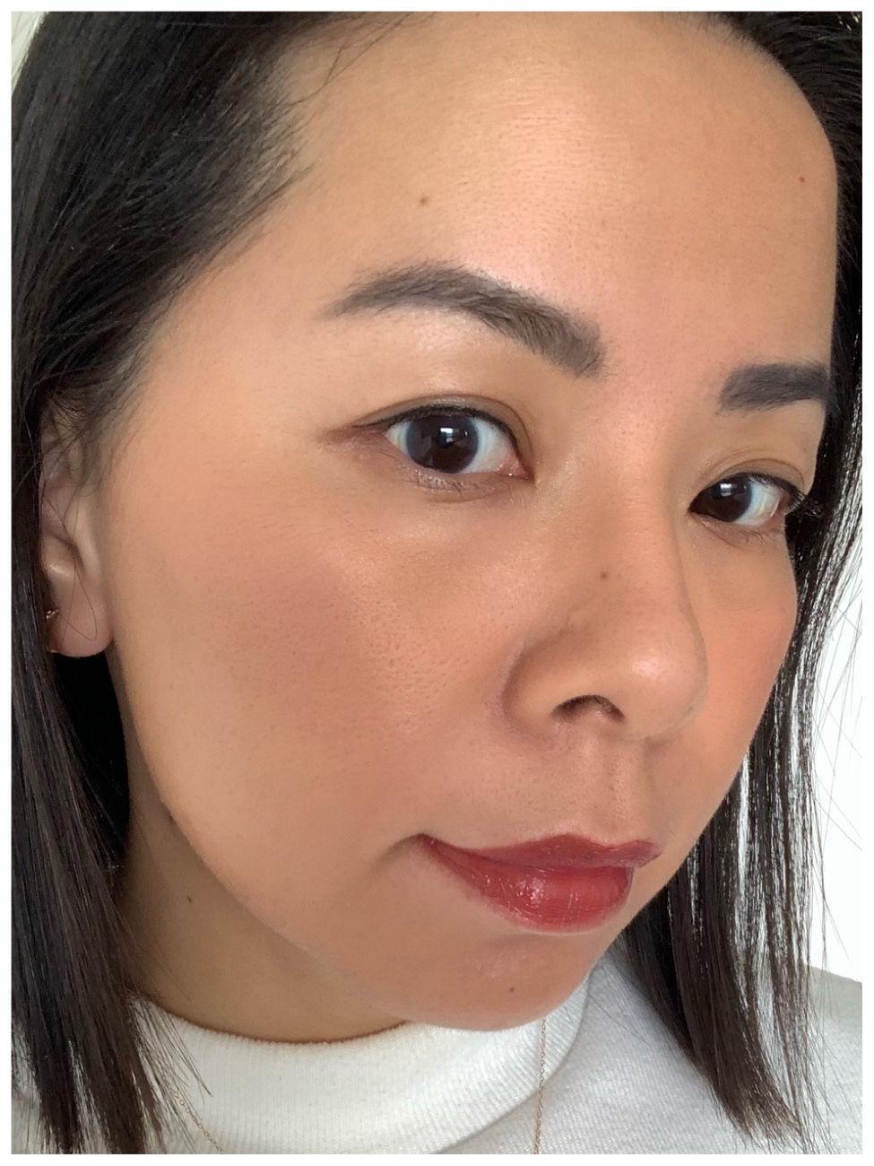 I wouldn’t say the finish or application was creamy or moisturising. I do have combination-oily skin so I cannot comment on how well it works on dry skin types. I do have some fine lines and texture to my skin which the foundation worked pretty well on top. It did not sink into my fine lines or enlarged pores. It did not look patchy at all. My first impression was pretty good and it stayed quite well despite applying no primer and I did not set it with anything on top. Side note, my husband did notice the foundation and he did comment that it looked quite powdery when looking at me from the side. I also noticed that the shade was darker under natural daylight, but I wanted to try it a few more times to confirm.