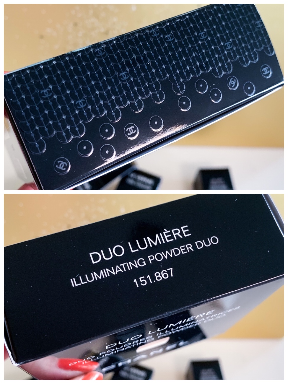 Every Chanel holiday collection, the highlighter is always the star of the show (IMO) and this year, it is no exception. This year Chanel has created a duo highlighter – Duo Lumière Illuminating Powder Duo. The sequin embossing on the highlighter is also seen on the sides of the box. The overall design is very festive. It comes with a small flat brush complete with it’s own velvet pouch. The highlighter also comes in a velvet pouch and as usual, the CC logo on the compact is gold instead of white.
