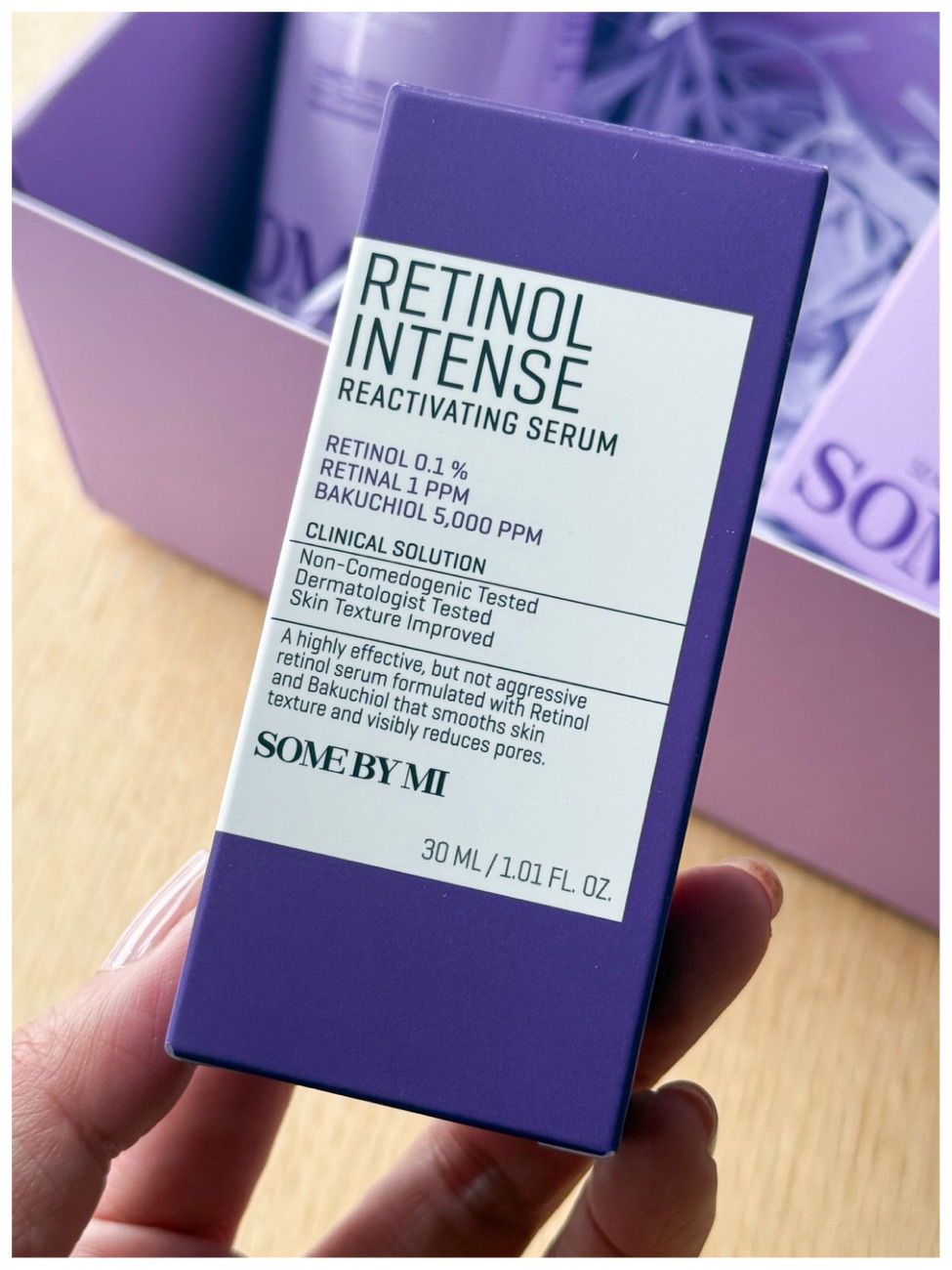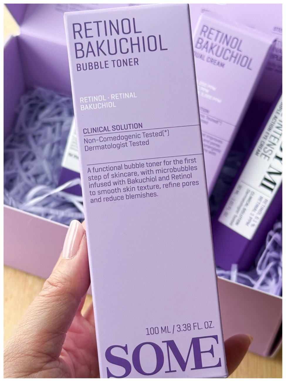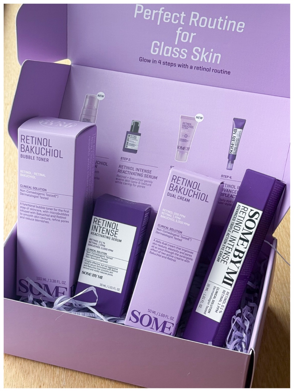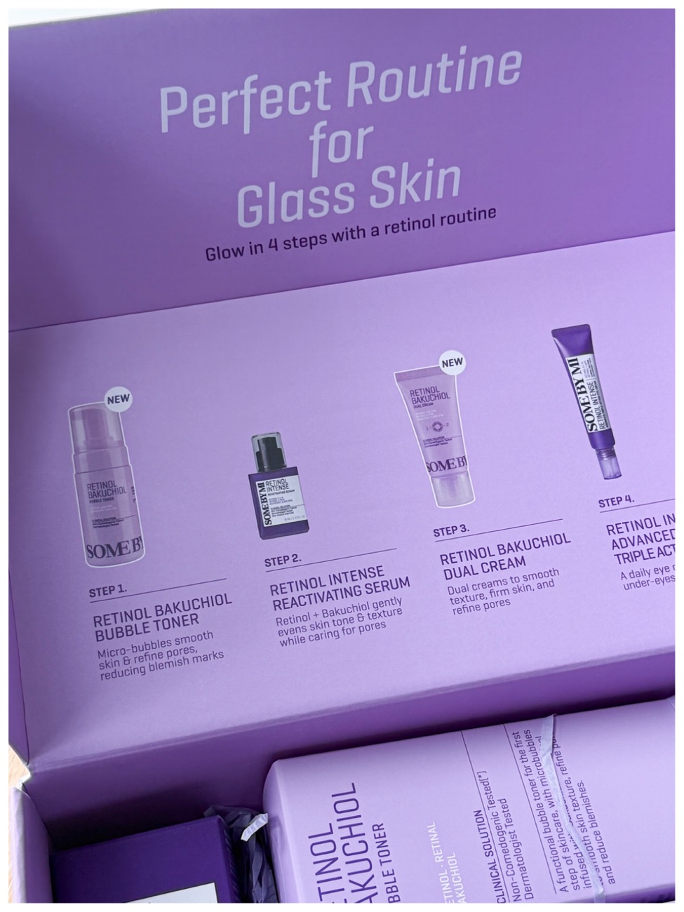 This is the StyleKorean x Some By Mi Perfect Routine for Glass Skin box with 4 full-sized products. It contains: Retinol Bakuchiol Bubble Toner, Retinol Intense Reactivating Serum, Retinol Bakuchiol Dual Cream, and Retinol Intense Advanced Triple Action Eye Cream. This box has a focus on retinol and retinol alternatives to reduce post-acne pigmentation, improve texture, refine the pores, firm the skin and even out skintone. Retinol also has many other benefits to the skin, so even if you do not have blemish or texture issues, you can still benefit from retinol. The Some By Mi retinol products are often a blend of retinol with ingredients are reintal, bakuchiol, niacinamide, panthenol, and hyaluronic acid. I will go through each product and briefly go through each ingredient below.