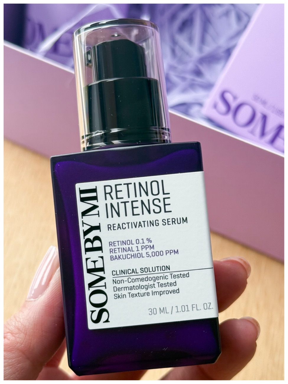 Once the toner is absorbed, I move onto the next step which is the serum. The Reactivating Serum is already a product in their retinol series (Retinol Intense) – and on the bottle it claims to have 0.1% retinol, 1ppm retinal and 5,000ppm bakuchiol. The word “intense” and the deep purple colour is consistent with their existing retinol range, and the lighter puprple colour and “retinol bakuchiol’ is consistent with the NEW products, which gives a less intesnse retinol concentration (in my opinon). However, I would expect the serum in a skincare range would contain the most concentration of the star ingredient and would be the most effective. So I would always purchase the serum in a range to try and determine efficacy of the range.
