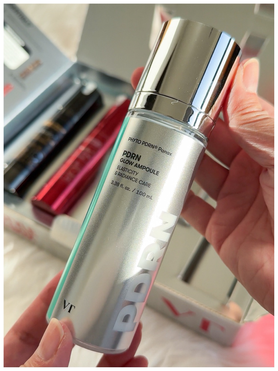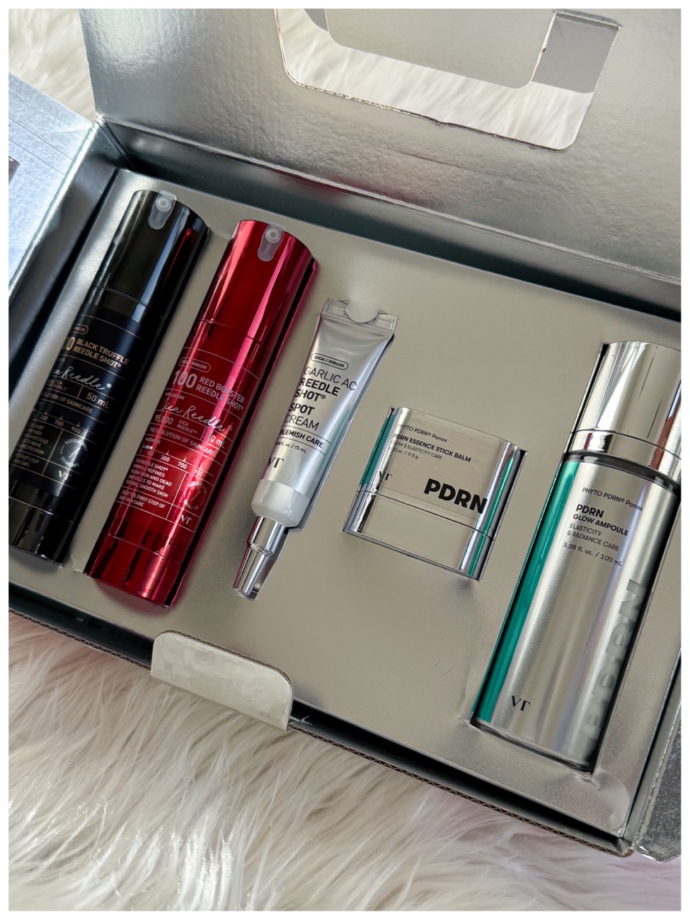 Products contained in the box: PDRN Glow Ampoule Mist, PDRN Essence Stick Balm, Garlic AC Reedle Shot Spot Cream, Red Booster Reedle Shot 100, and the Black Truffle Reedle Shot 100. I think VT Cosmetics became viral and well-known from the Reedle Shots, and now it has been replicated by many brands. It is a go-to product if you want light exfoliation and better absorption of products. From the original Reedle Shots (50, 100, 300, and 700), VT then came out with reedle shots with booster ingredients. Such as vitamin C, collagen, Cica, PDRN, reti-A, etc. Now we have Black Truffle and Dragon’s Blood. PDRN has also been very popular over the last year where the injectible kind of PDRN does wonders for skin brightening, plumping, etc. Skincare also tried ot harness this benefit in the form of a topical serum/cream. In this box, we also have the PDRN stick balm and an ampoule spray.