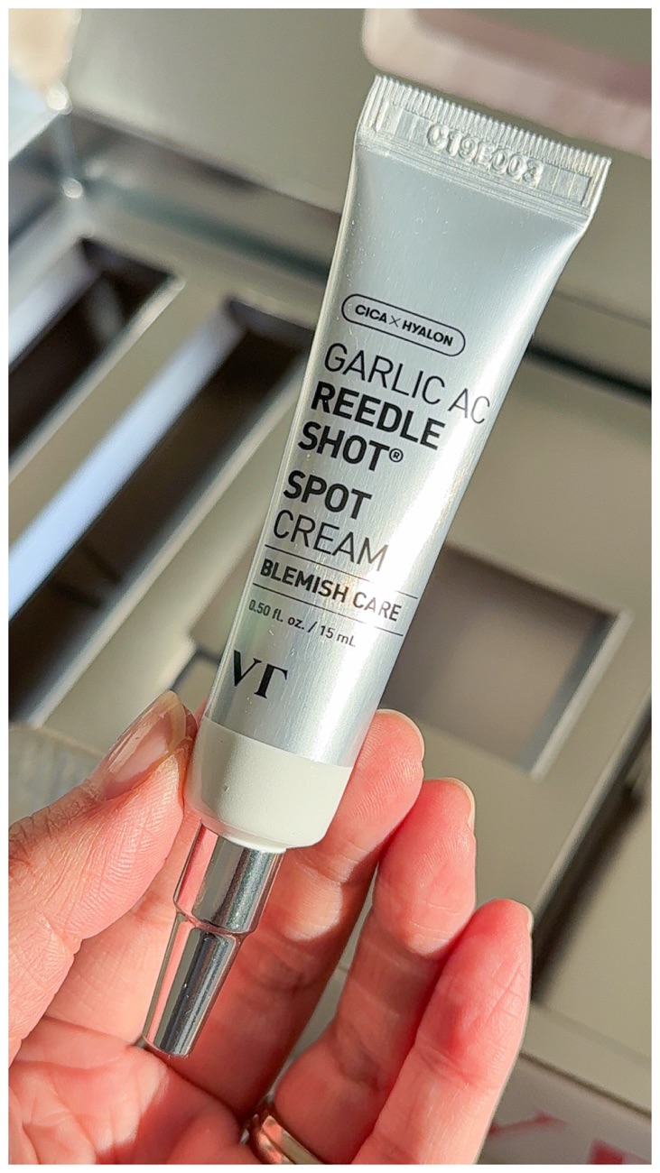 Next, it would be the Garlic AC Reedle Shot Spot Cream. This is a spot cream for blemishes combined with the delivery effects of reedles. I already love the reedle shots by VT Cosmetics and before this spot cream, I use either the 300 or 700 reedle shot serum and then use my own pimple spot cream on top. Now VT Cosmetics has come out with a convenient product to target spots. I’m not sure about the Garlic AC ingredient as this is the first time I’ve heard of it. I have used this a couple of times on really angry spots that are under the skin. I can feel the prickly reedles even from a tiny spot of cream and it did take about 2-3 days for my pimple to go down. The spot cream blends into the skin easily without any residue or film on the skin, so it is invisible.