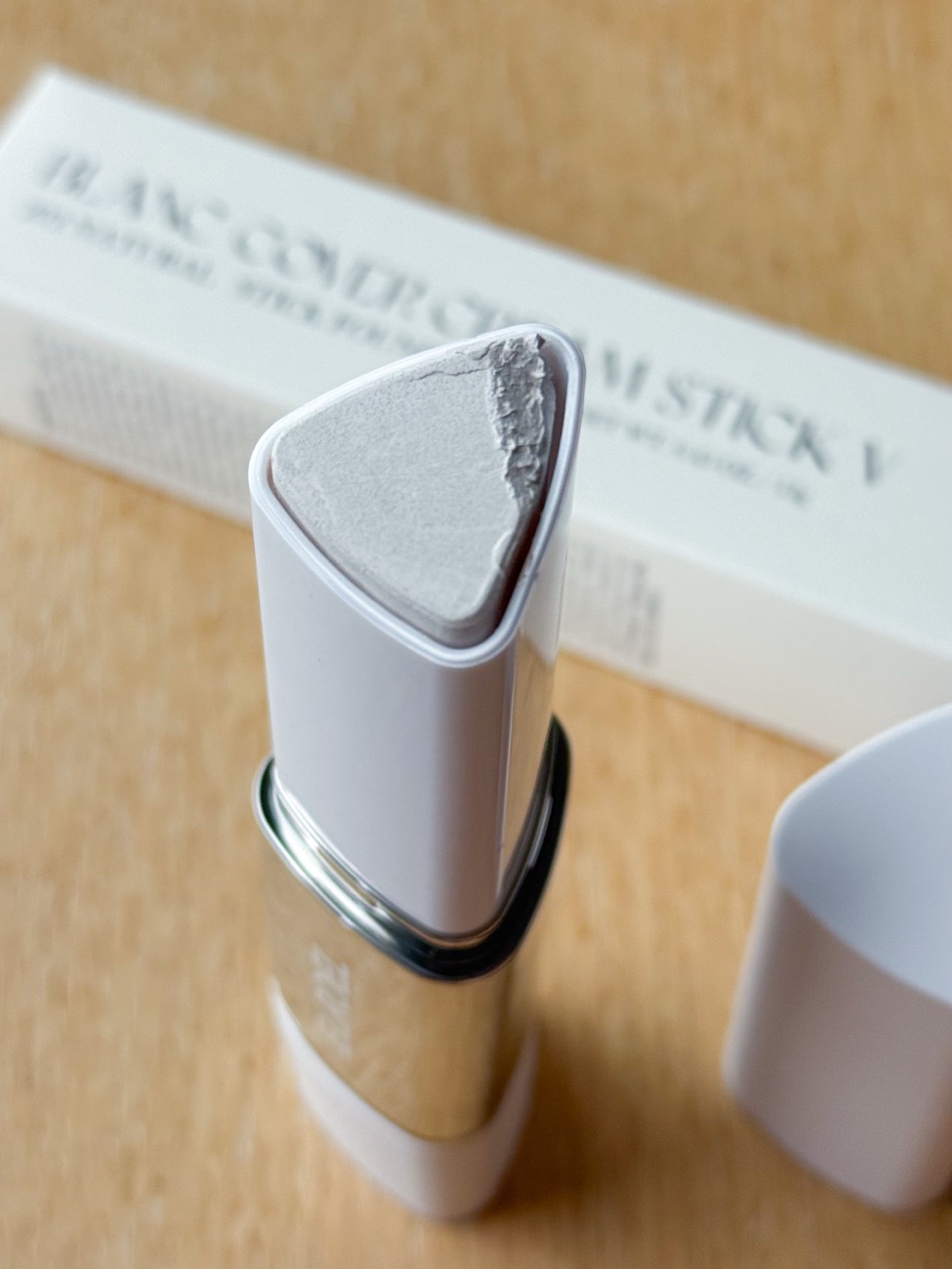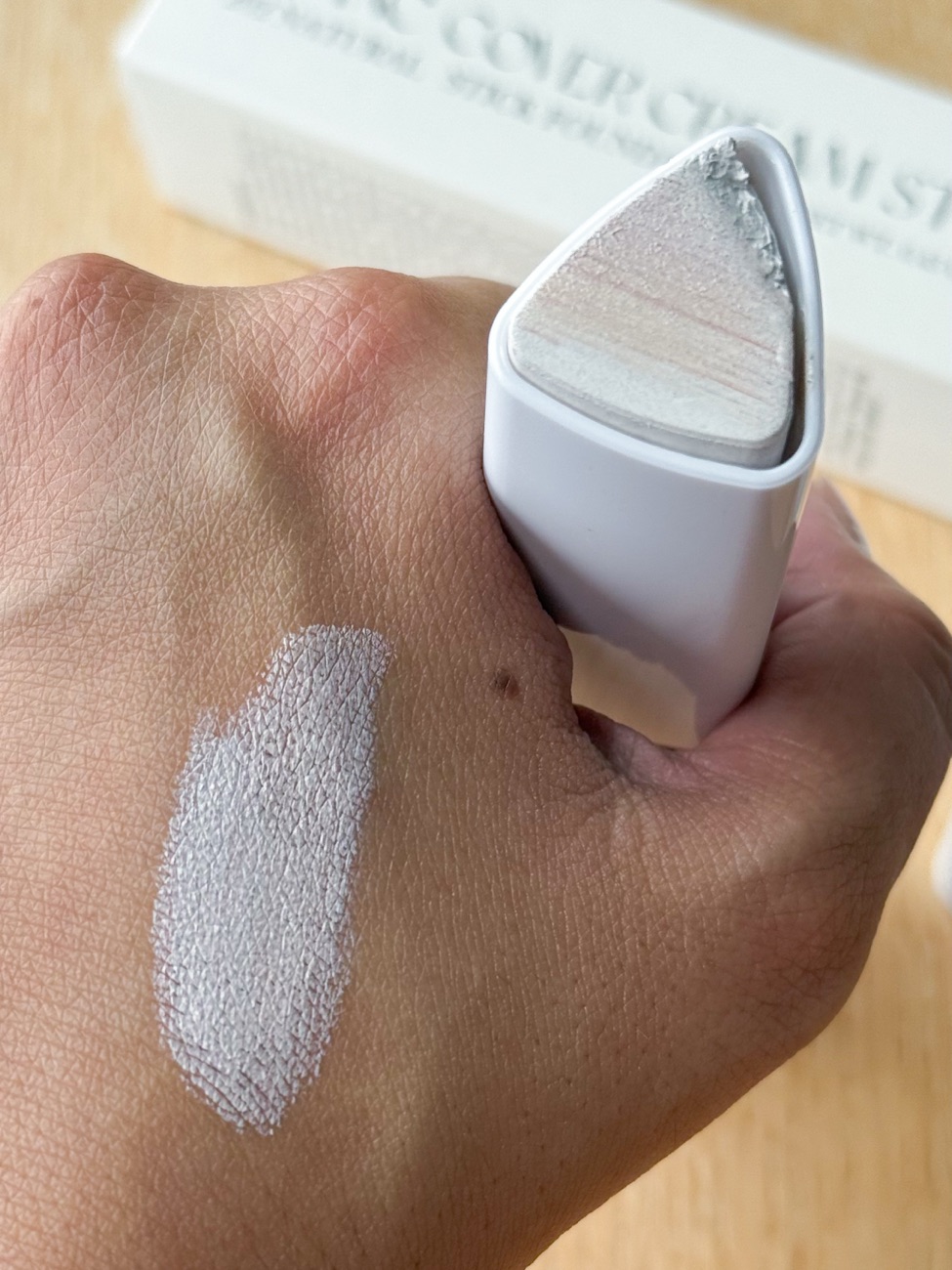 Before touching the foundation stick, the product is white. When you swipe over the product, you can see the specks of pigment blending into the white base. It looks a little gritty and not smooth-looking, but that is the colour pigments in the formula that made it that way. As the pigment breaks down, the specks will disappear.