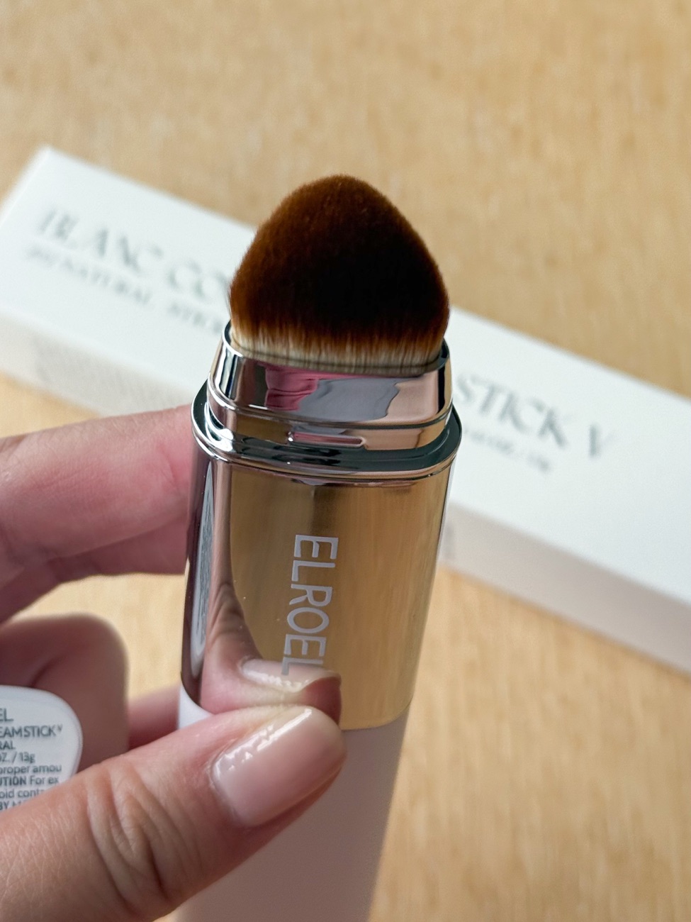 This is the Elroel Blanc Cover Cream Stick V (#202 Natural). This innovative color- changing makeup stick starts as a soft white balm and transforms into a silky, tinted cream that blends seamlessly into your skin. With each stroke of the built-in brush, collagen capsules break open to trigger the color change. Enjoy a clean, seamless application from start to finish. Our included brush and the cover up makeup foundation formula is a match made in heaven—designed to blend like a dream for that zero mess finish.Contains 45,800PPM French Collagen that boost the tiring skin.