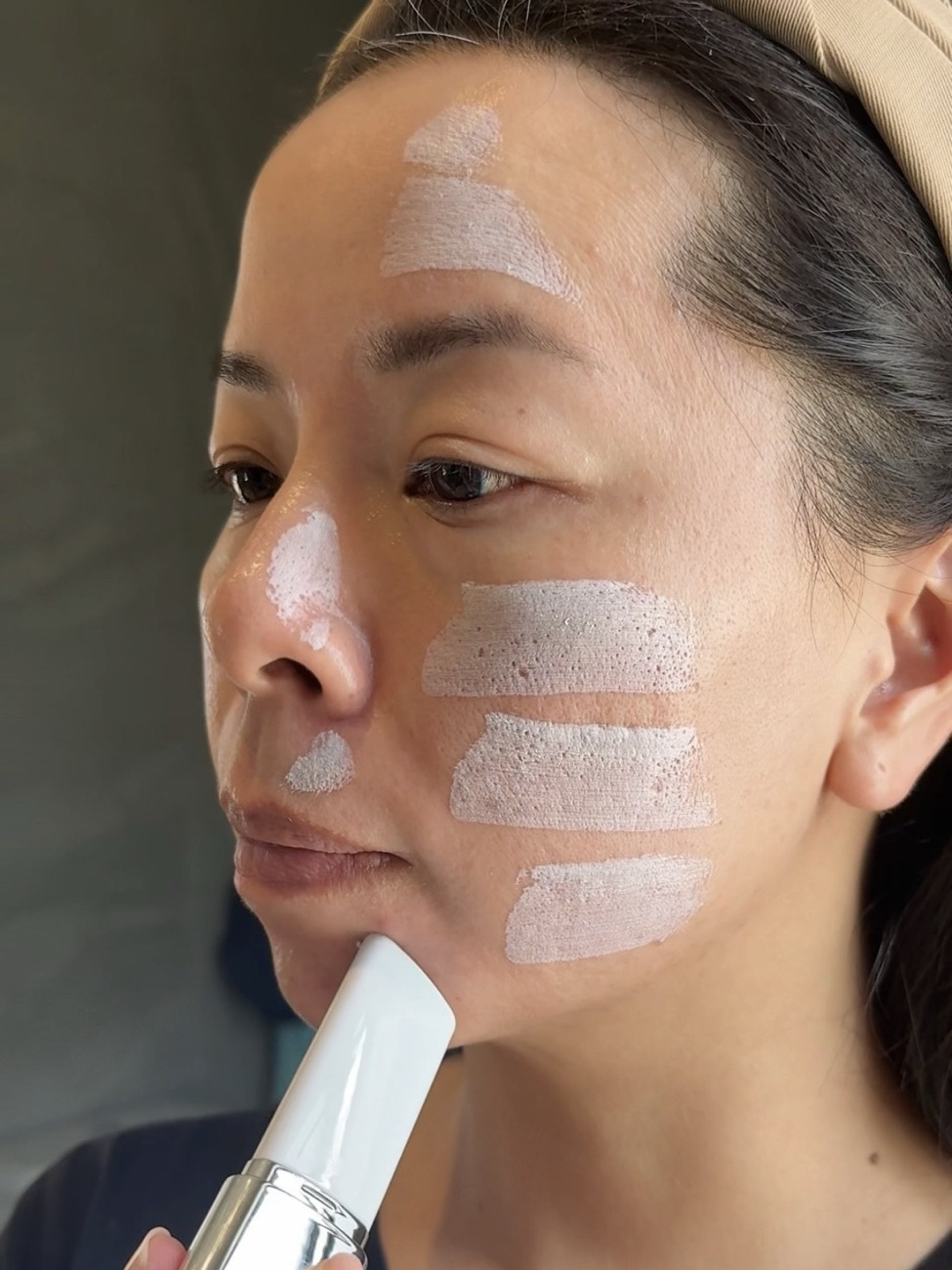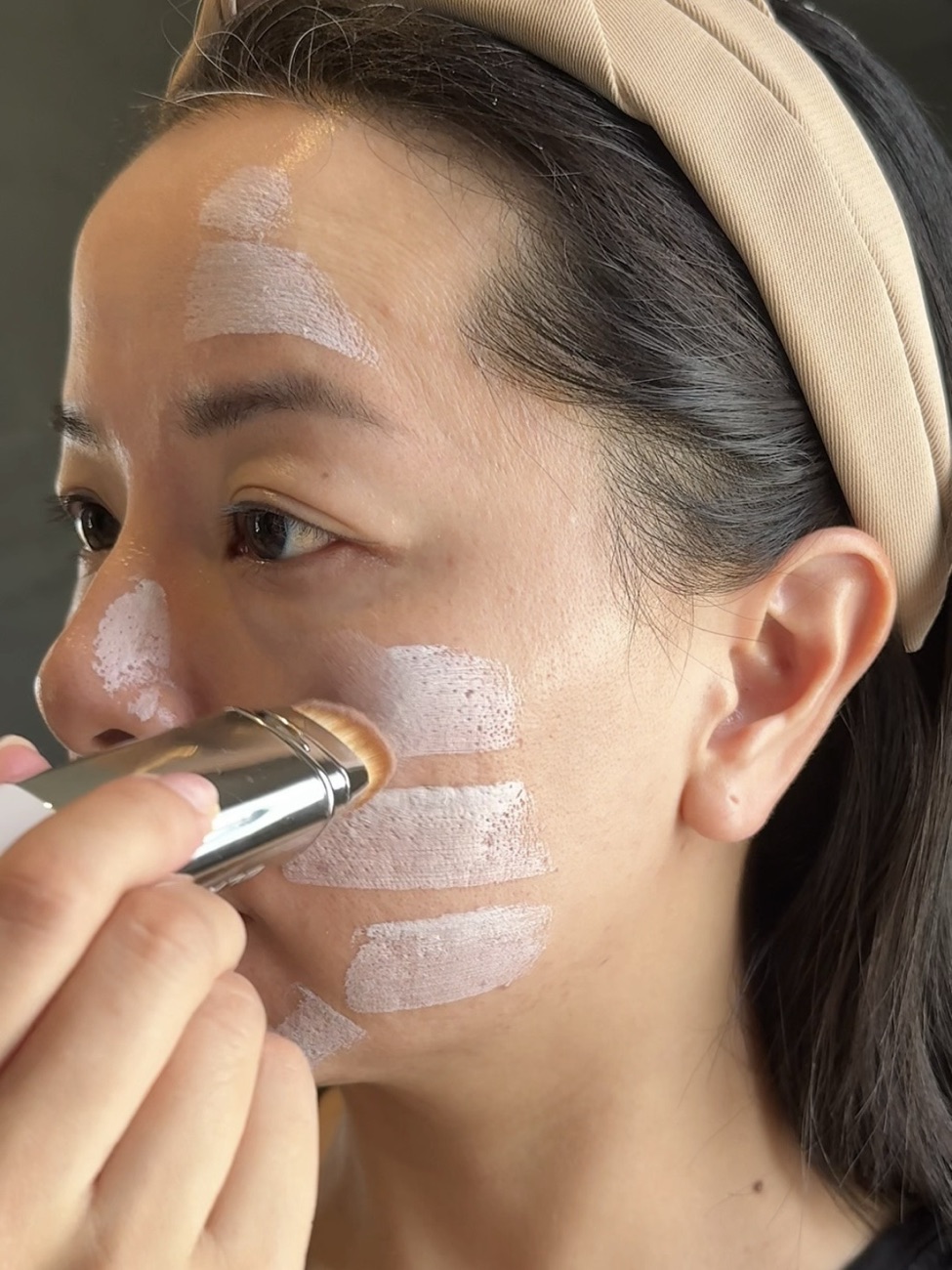 This foundation does not have any SPF, so make sure you use SPF underneath. I usually swipe the foundation all over my face and then blend out. However, the formula is a little dry from the stick, and by the time you want to blend the other side it would be a little difficult to get a good seamless blend.